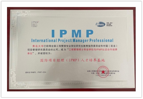 近日,青岛大学获得全国工程管理专业学位研究生教育指导委员会和中国(双法)项目管理研究委员会的认可,成为“工程管理硕士专业学位与IPMP认证合作培养单位”,并被授权为:国际项目经理(IPMP)人才培养基地,授权证书编号: IPMP-G54。