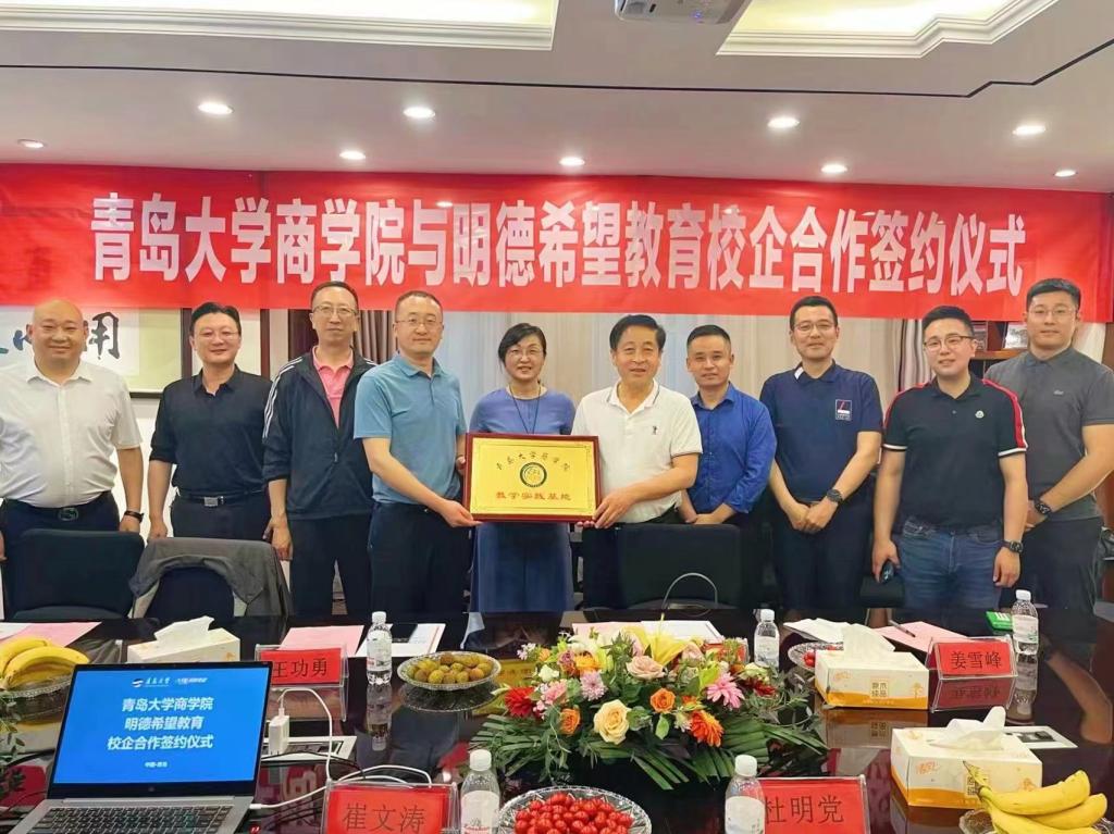 与明德希望教育教学实践基地签约挂牌仪式在青岛富源集团会议室举行。富源集团董事长崔文涛、副总裁韩磊、明德希望教育总经理杨言鑫、副总经理司诺、青岛校区主任陈之圣、商学院党委书记王功勇、党委副书记尼梅颉、学工办主任李鹏、团委书记姜雪峰出席了共建仪式。