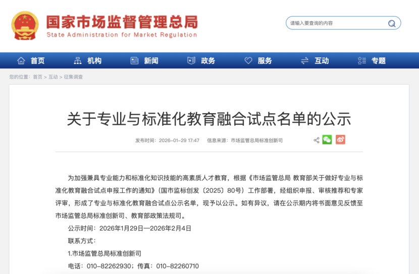 近日,国家市场监管总局和教育部联合公布全国专业与标准化教育融合试点名单,群p