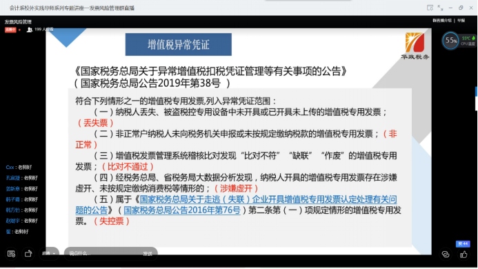 在第三部分异常扣除凭证风险的讲述中,为了让同学们更好的理解和掌握,老师不仅援引了《国家税务总局关于增值税扣税凭证管理等有关事项地公告》等相关文件指导,还结合相关实际案例进行详细地描述。