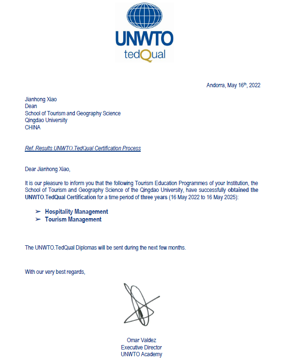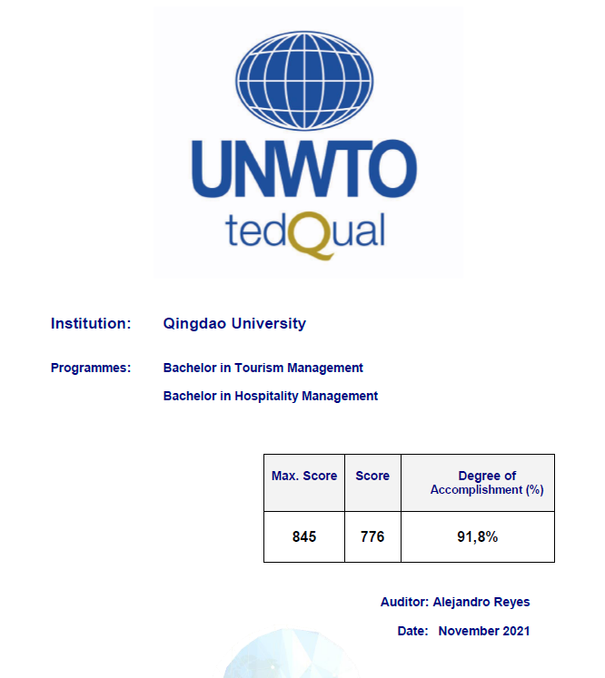 2022年5月16日,联合国世界旅游组织教育质量认证委员会(UNWTO.TedQual)函告通知,我院旅游管理、酒店管理两个本科专业通过该机构的旅游教育质量国际认证,认证有效期3年,这是目前青岛大学第一个国际专业认证,也是山东省首家通过该项国际认证的本科高等院校。旅游管理、酒店管理两个本科专业是首次参与联合国世界旅游组织教育质量认证,通过该认证显示这两个专业已建立起高水平、国际化的专业教育体系。