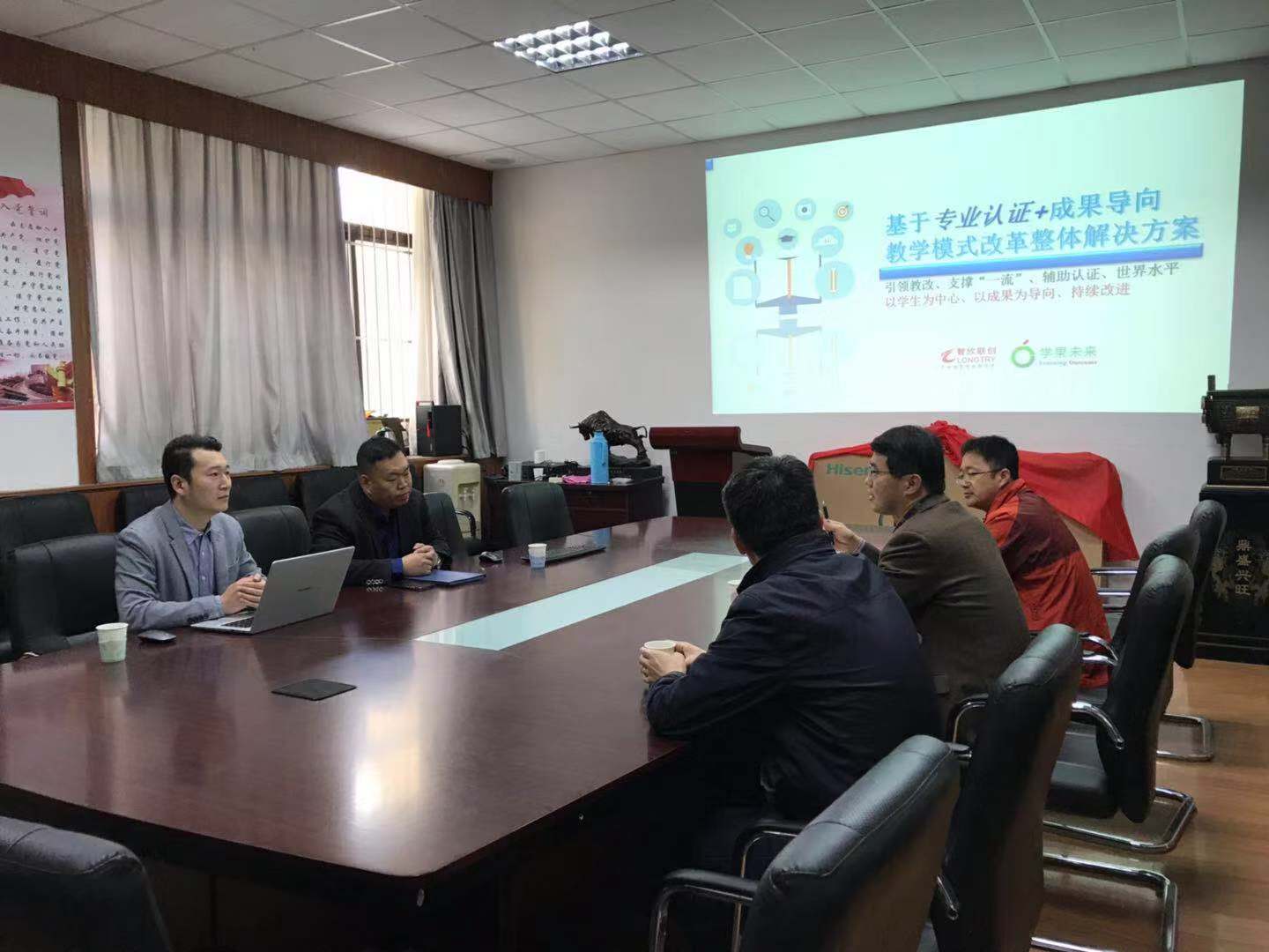北京智欣联创科技有限公司副总经理白玉山先生以“基于专业认证+成果导向教学模式改革整体解决方案”为题,从认证背景、质量提升、平台特点、企业概况等方面介绍了北京智欣联创科技有限公司对于专业教学质量提升的解决思路和具体方案。会谈中,双方就进一步合作进行了深入探讨。